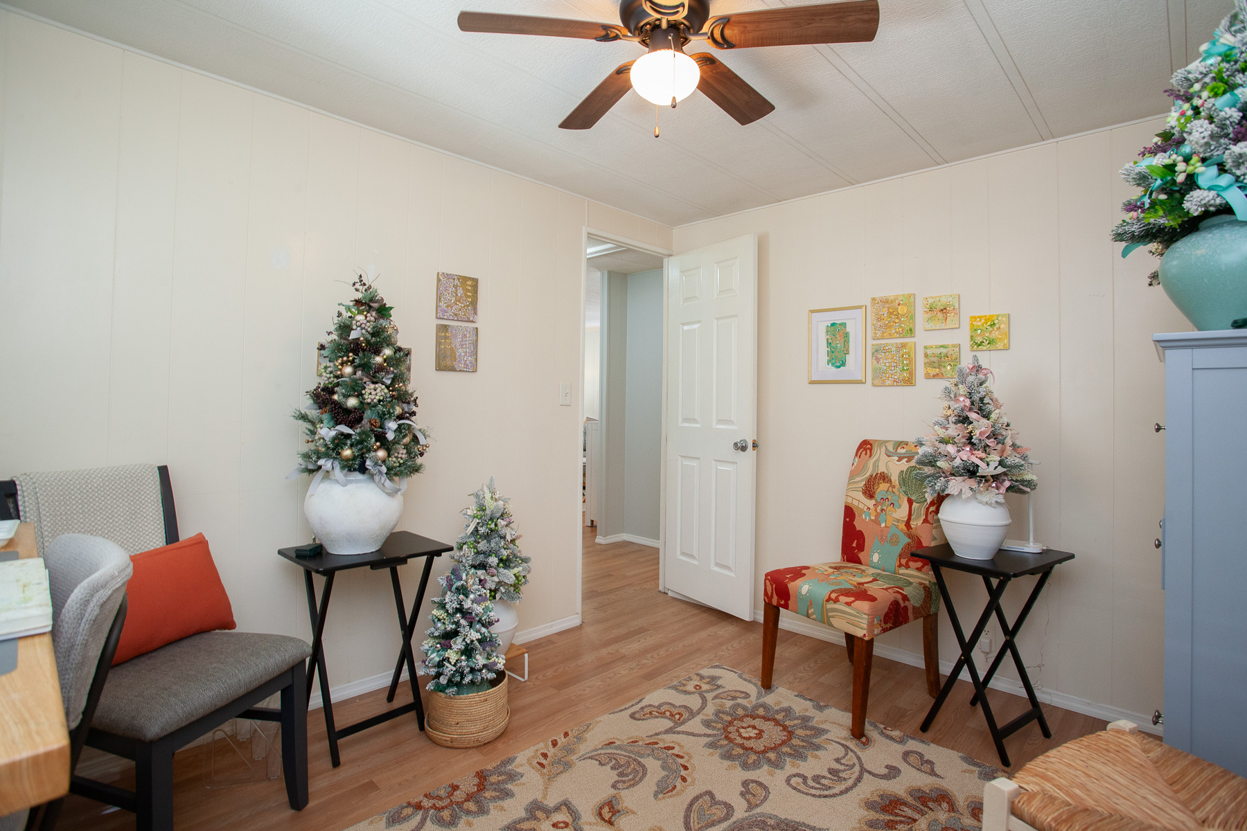 This unit is 1979, 840++ sq ft. Updated 2020. Open floor kitchen with the breakfast bar located in the middle of the home. Plus, a separate coffee bar station. White cabinets with Stainless steel appliances. The front of the home has several beautiful bay windows, which add plenty of natural light throughout. This home comes with a transferable roof over warranty installed in 2024. No neighbors behind the home.