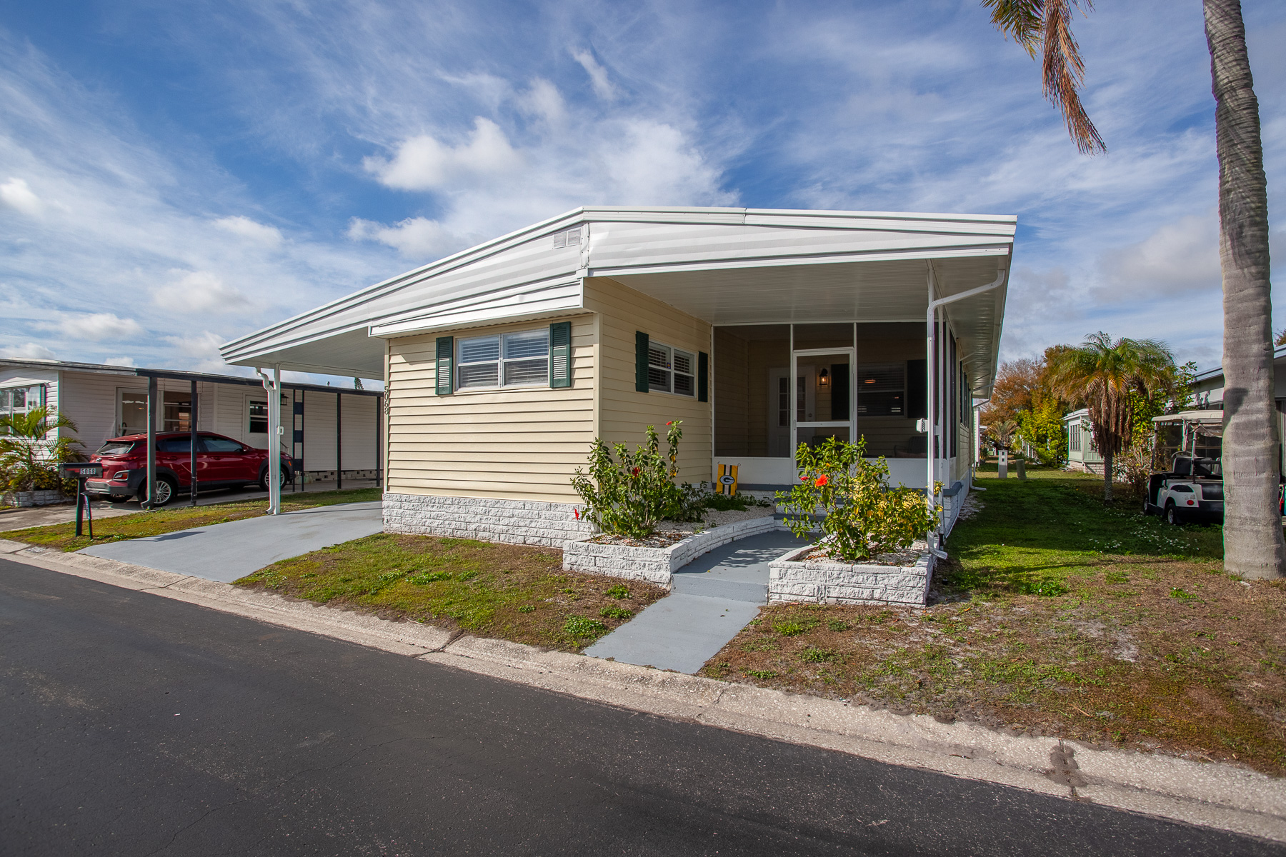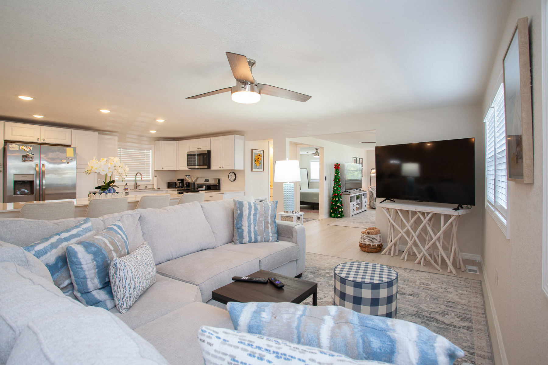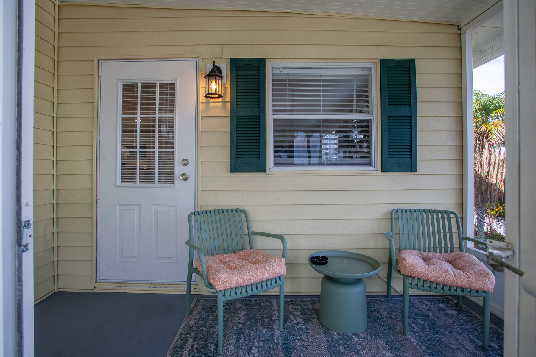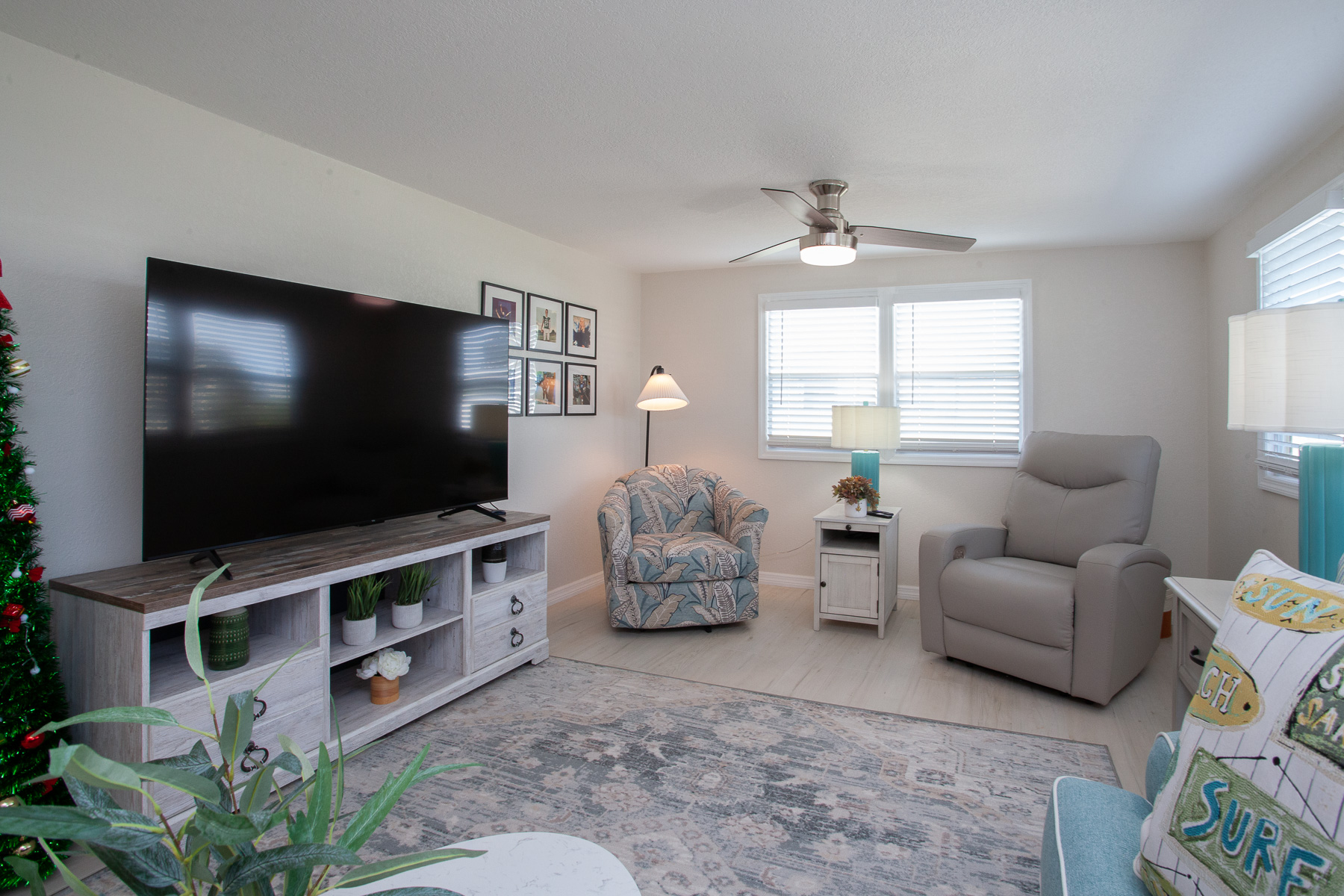 This unit is 1972, 1156++ sq ft. Fully updated 2024. Open floor kitchen plan. Extra-large breakfast bar located in the middle between the kitchen and living room area. Granite countertops with new Stainless-steel appliances. This home offers an additional living space located at the end of the living room. The primary bathroom has a beautiful, tiled walk-in shower. The guest bedroom is located on the other side of the home, with a tiled walk-in shower. Open screened-in front porch. Plus, a beautiful brick open air patio on the side of the home. New roof over. Tankless water heater. This home comes furnished with all new furniture.