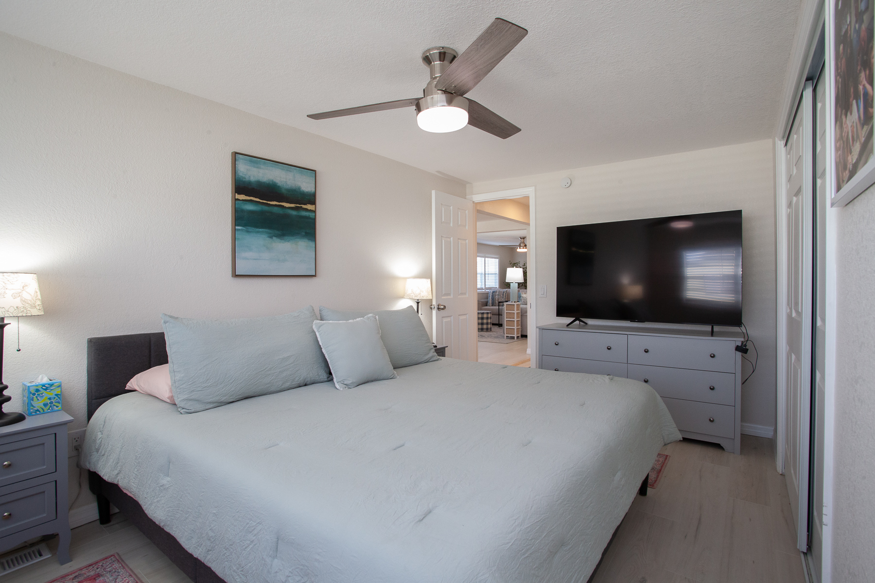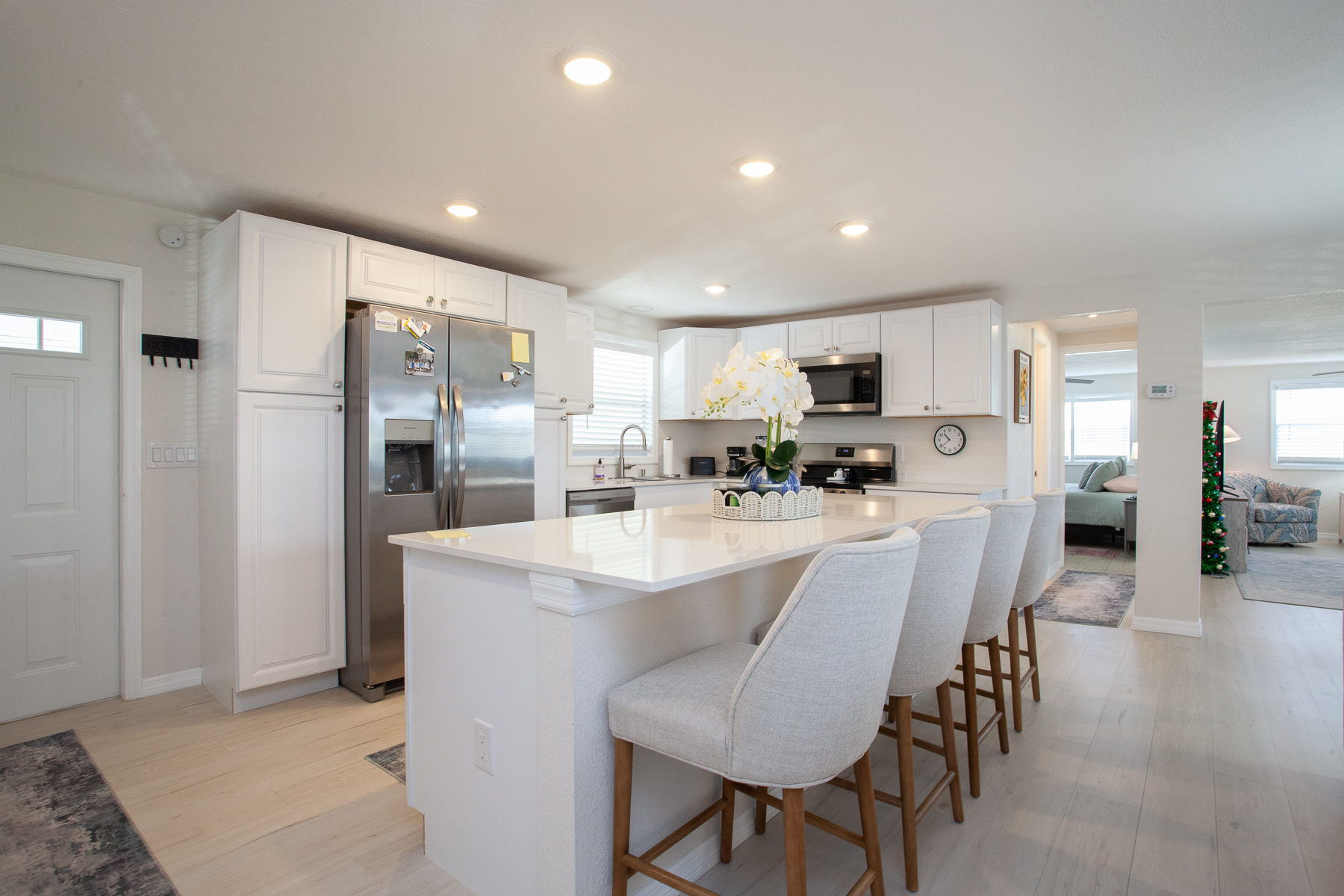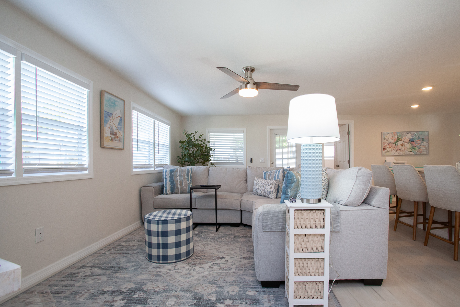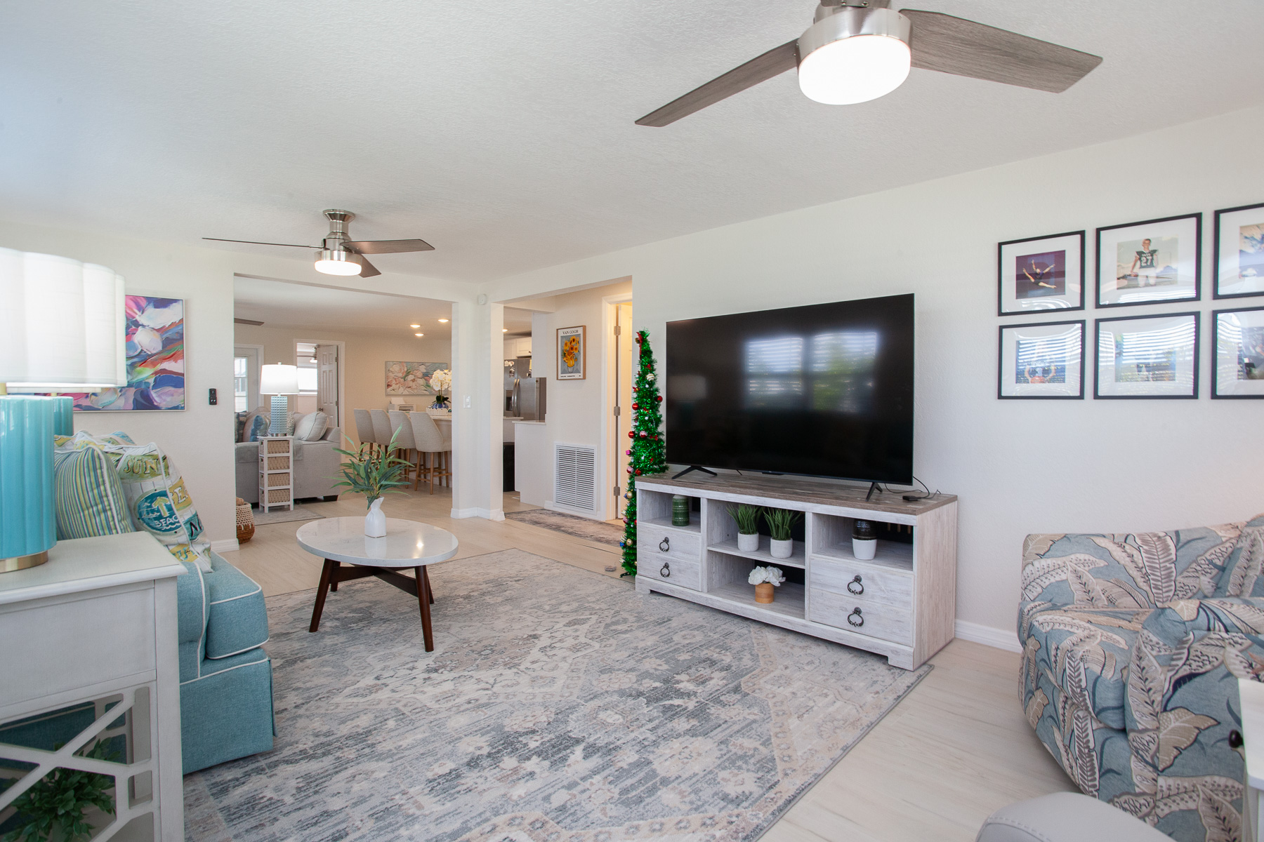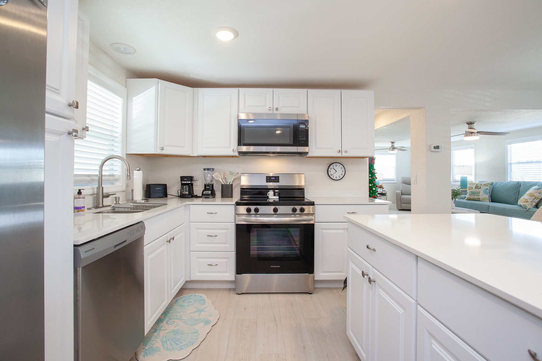 This unit is 1972, 1156++ sq ft. Fully updated 2024. Open floor kitchen plan. Extra-large breakfast bar located in the middle between the kitchen and living room area. Granite countertops with new Stainless-steel appliances. This home offers an additional living space located at the end of the living room. The primary bathroom has a beautiful, tiled walk-in shower. The guest bedroom is located on the other side of the home, with a tiled walk-in shower. Open screened-in front porch. Plus, a beautiful brick open air patio on the side of the home. New roof over. Tankless water heater. This home comes furnished with all new furniture.